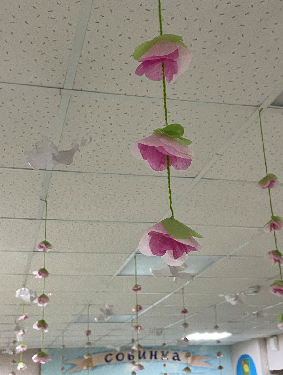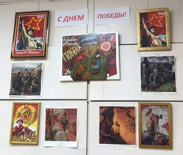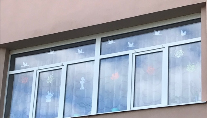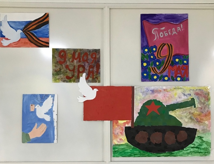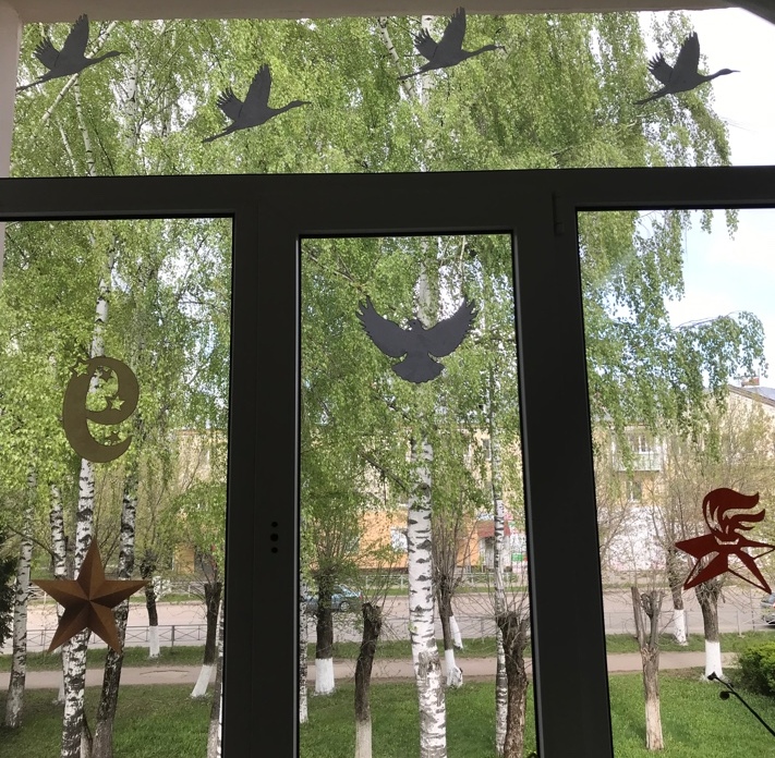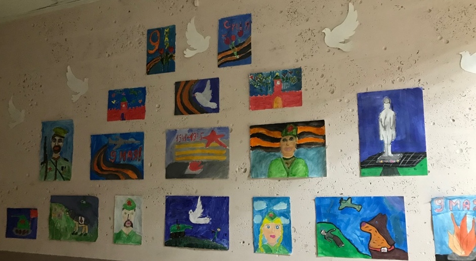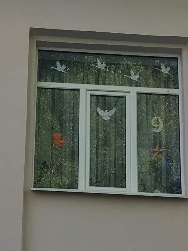 Для создания праздничного настроения учащиеся объединений вместе со своими педагогами оформили холл первого этажа. Организована выставка рисунков и плакатов «Победа глазами детей» (объединение «Акварелька», педагог Антонова Е.А.). Весь холл украшен цветочными гирляндами распустившихся яблонь и порхающих под потолком белых, голубей – символов мира (объединения «Бисероплетение», педагог Трусова Н.А. и «Профлиния», педагог Зубкова А.В.). С экрана телевизора идет концерт танцевального коллектива «Эдельвейс» под названием «Поклонимся великим тем годам!» (педагог Стати М.А.). Из окон первого этажа слышатся песни военных и послевоенных лет. А окна второго этажа украшены символами войны и мира. Отмечая День Победы, мы прежде всего вспоминаем о важности поддержания мира на планете. Всероссийскую акцию «Окна Победы!» поддержали объединения «Преображение», педагог Тощева Н.В., «Бисероплетение» педагог Трусова Н.А., студия скрапбукинг «Пастила», педагог Воробьева И.А. и танцевальный коллектив «Эдельвейс», педагог Стати М.А. Ценность этой акции в том, что мы выражаем признательность нашим ветеранам. В кабинете студии «Палитра», педагог Аршинова В.Н. оформлена выставка картин «С Днем Победы!». А по рекомендации Министерства образования и молодежной политики Владимирской области о проведении профилактической акции , при входе в холл первого этажа размещены информационные фотокарточки «Мифы и правда» о войне, подготовленные МВД России. Цель акции развитие культурной информационной безопасности и расширения знаний о Великой Отечественной Войне, о доблести, о подвигах, о славе наших воинов освободителей, о том, какой ценой была завоевана ПОБЕДА!