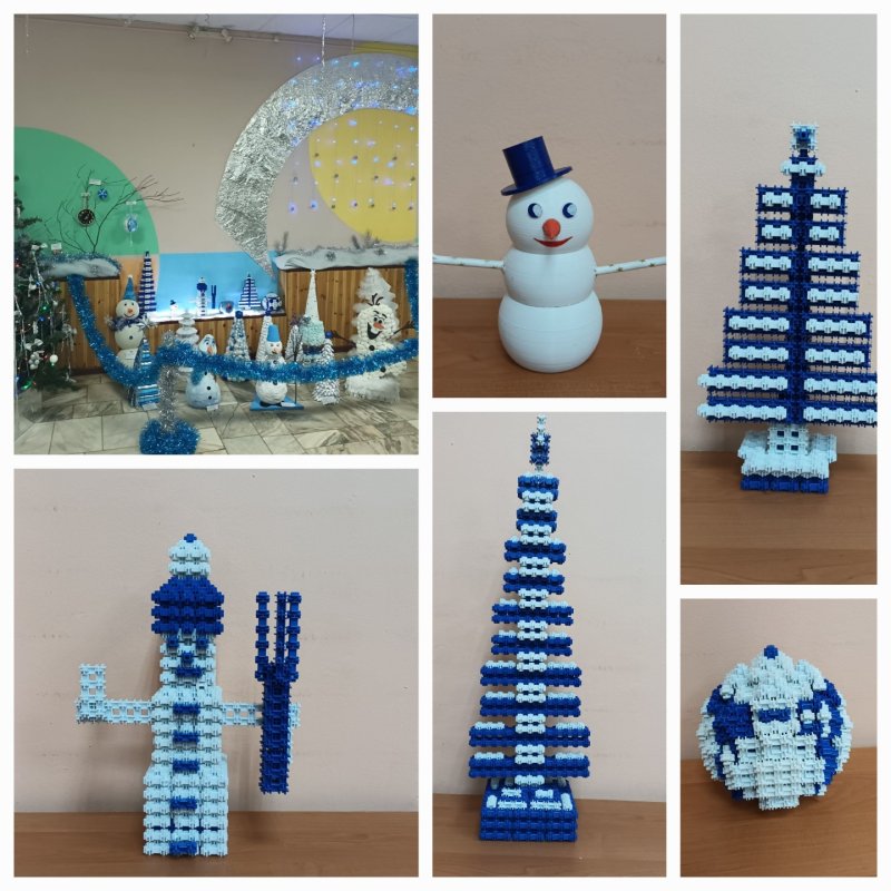 Учащиеся объединения НТМ представили на ней несколько работ. Захар В. и Максим Б. сконструировали по стройной лесной красавице-елке из конструктора Фанкластик. Давид К. и Иван С. смоделировали рождественскую елку из картона, кропотливо работая над ней несколько дней. Творческую работу из конструктора "Снеговик- часовой" также представил Владимир К., новогодний ёлочный шар сделанный из конструктора - Давид К.