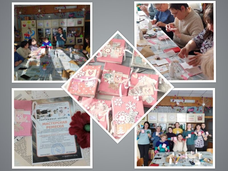 В технике скрапбукинг участники изготовили мини-альбом гармошка «Зимние забавы», который представила я. Изучили новые и вспомнили уже знакомые техники и приемы в скрапбукинге, так как эта встреча уже пятая для меня, юбилейная. Участникам очень нравится эта техника и я снова получаю приглашения. В этот раз я выбрала мини-альбом. Такая работа относится к прикладному скрапбукингу и напрямую выполняет идею самого скрапбукинга. Сам альбом радует своего обладателя долгие годы и несет память о приятных моментах жизни или дорогих людях. Сделали переплет «Гармошка», обтягивали обложку тканью. Применяли тематические элементы и различные материалы, которые на первый взгляд не относятся к скрапбукингу и теме зимы, например фатин, калька, фетр и различные виды бумаги в розовом цвете. Штамповали и эмбоссили. А в результате 12 мини-альбомов появились на свет. Все успели в срок и очень остались довольны результатом и встречей. Приятно пообщались в перерыве между мастер классами за кружкой чая.