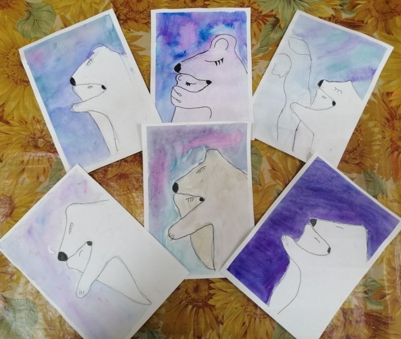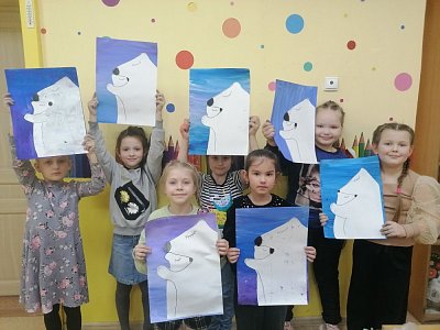 Ребята из творческого объединения «Акварелька» тоже не остались в стороне от этого события. Они нарисовали множество белых медведей в разных техниках, а также выполнили комбинированную работу, на которой изобразили белого медведя на фоне арктического пейзажа.