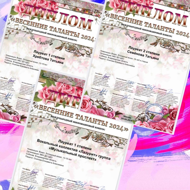 Старшая группа и солисты вокального коллектива «Лазурит» заняли призовые места в международном конкурсе "Весенние таланты 2024" по видеозаписям от Московского фестивального движения Музыкантофф.