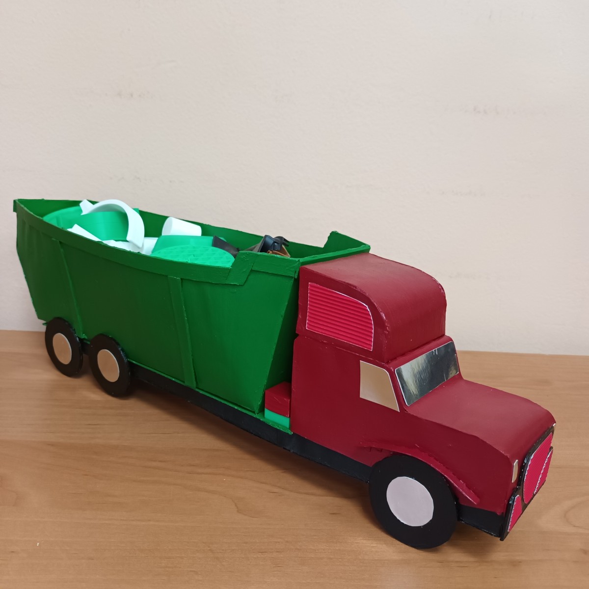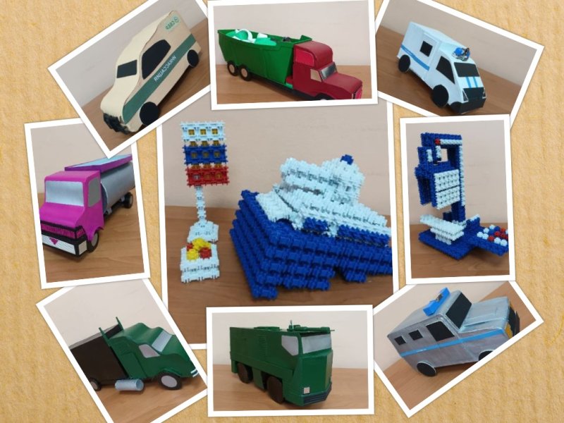 Грузовая машина – фургон, предназначена для перевозок грузов на дальнее расстояние. Кабина машины предусматривает комнату отдыха для водителя. Назначение большой машины-самосвала перевозка вредных отходов производства к месту их переработки. Машина-автоцистерна нужна для перевозки молока от фермы к молокозаводу. Военная машина «Тайфун» относится к семейству бронеавтомобилей повышенной защищённости. Может перевозить до 16 человек. Автомобили специального назначения: инкассация – для перевозки денежной массы, «Полиция» - для передвижения опергруппы по городу, полицейский фургон – для перевозки преступников. Из конструктора Фанкластик сконструирован космический спутник, памятник героям-танкистам ВОВ, медицинский сканер.