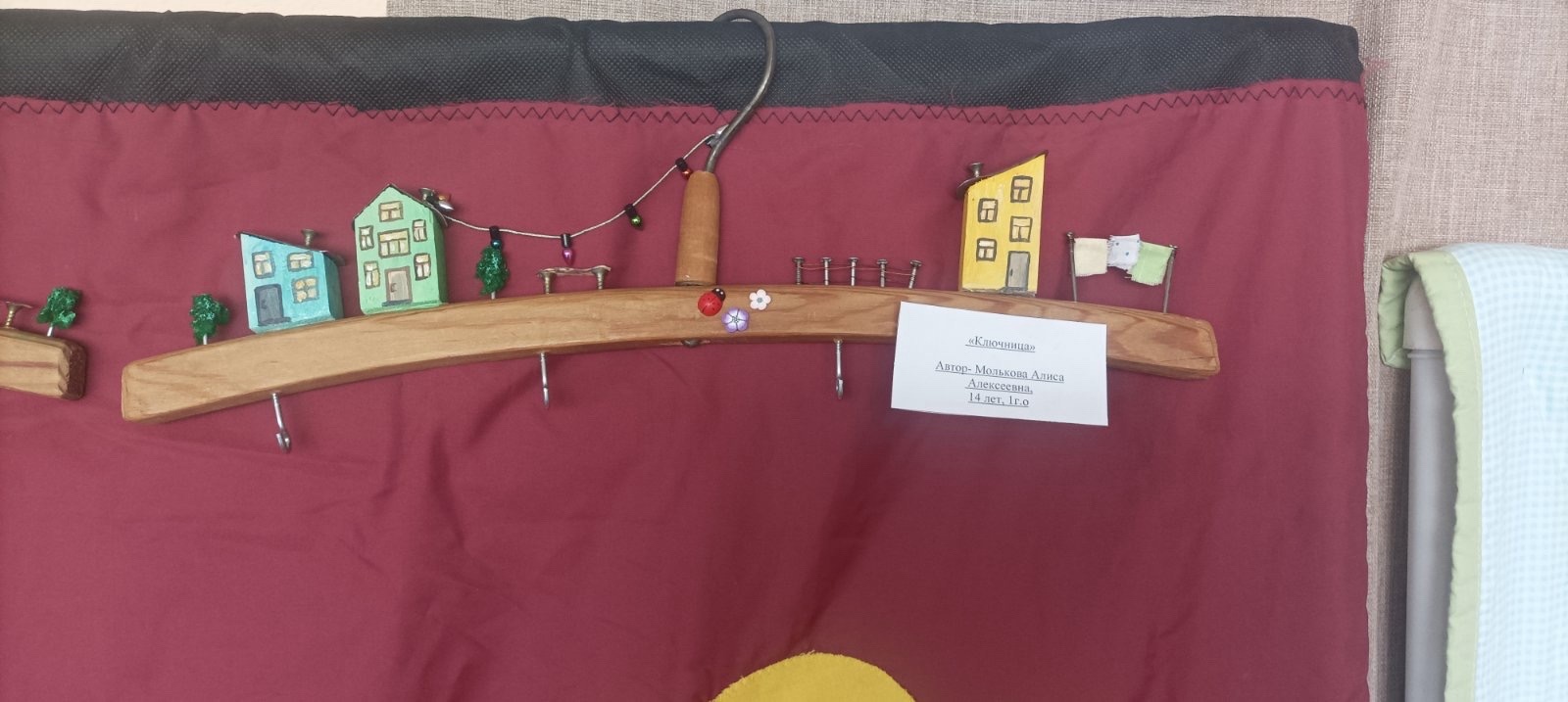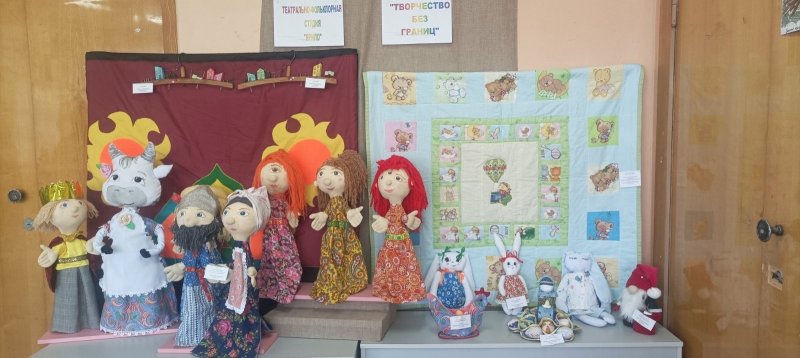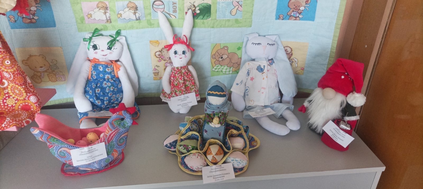 Свою экспозицию мы назвали «Творчество без границ», потому что представили работы разных направлений. Одно из них - техника лоскутного шитья. Среди представленных работ мягкие игрушки-сплюшки, куклы-столбушки, пасхальная и новогодняя работы, лоскутное одеяло, оригинальные ключницы из обычной вешалки - плечиков. Куклы для кукольного спектакля «Крошечка – Хаврошечка».