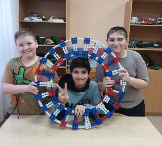 Вот такое колесо из конструктора собрали сегодня на занятие три друга из объединения Начальное техническое моделирование. Одному такую поделку не собрать, трудно. А совместно с друзьями справились! Распределили обязанности, один отбирает нужные детали, другой собирает звенья, а третий эти звенья скрепляет в такое большое и весёлое колесо.
