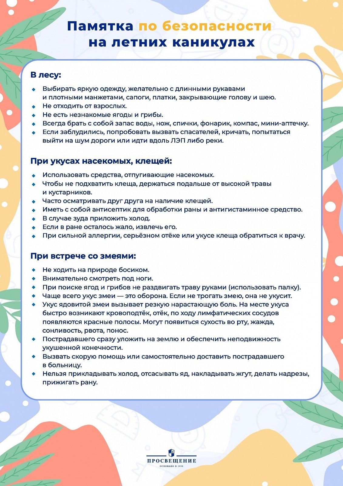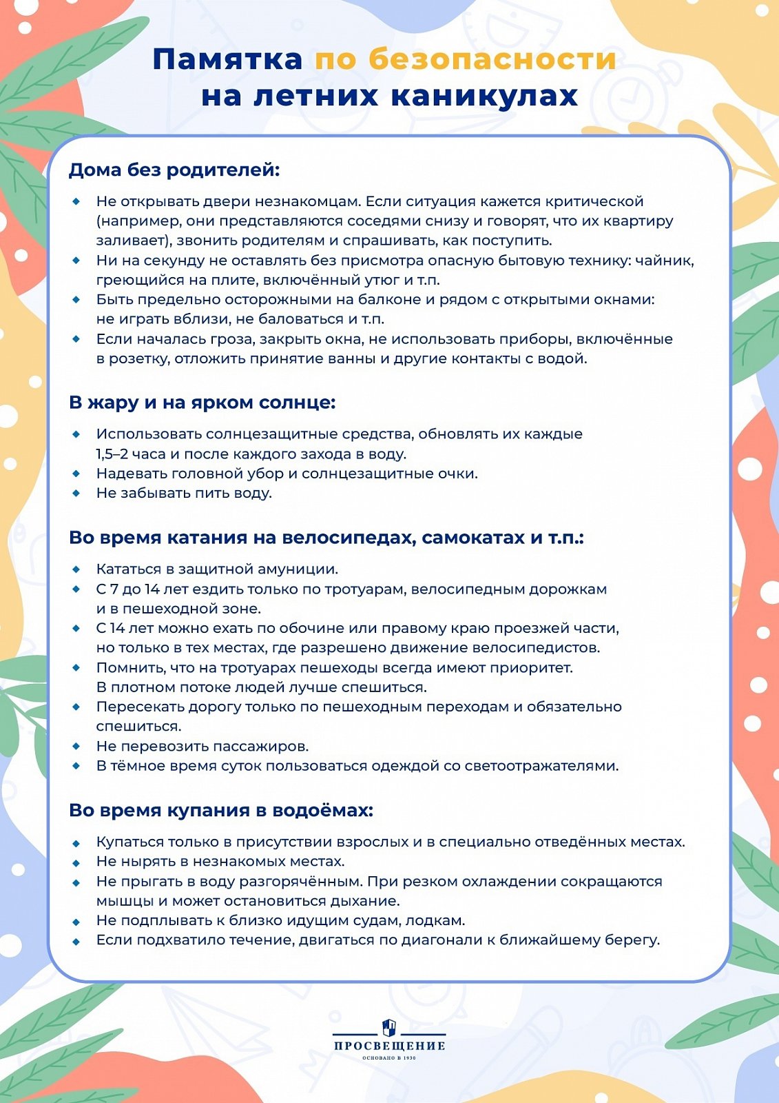 Дорогие ребята, уважаемые родители! Итак, впереди летние каникулы – чудное время, которое так ожидаемо каждым школьником – от первоклассника до выпускника. Это славные деньки, когда нет учебы и, соответственно, отсутствует необходимость просыпаться рано, идти в школу и учиться. Поэтому позаботимся о БЕЗОПАСНОСТИ.