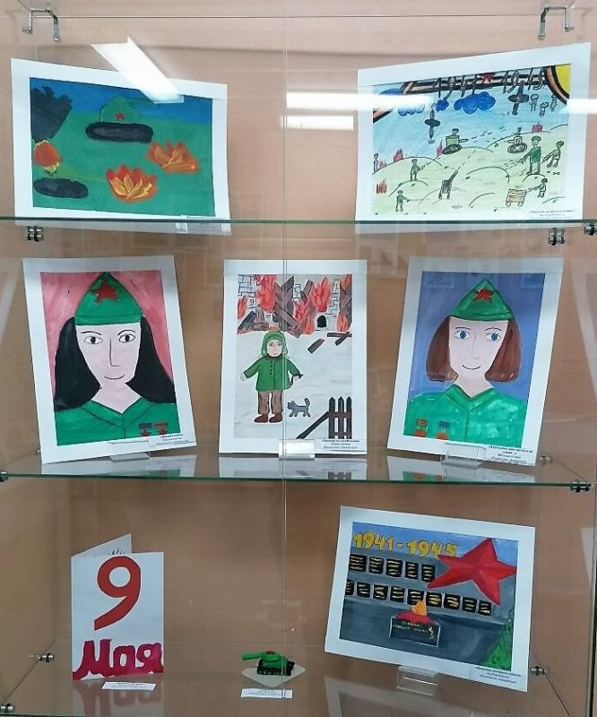В преддверии 75 годовщины Великой Победы на выставке учащиеся подготовили рисунки, открытки, посвященные этому великому празднику.