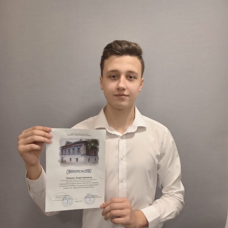 Поздравляем Егора П. , учащегося объединения "Раздумья над прочитанным" ( педагог Новикова Т.А.) с Первой премией Солоухина В.А. за сочинение – анализ изобразительно- выразительных средств языка в произведениях В.А. Солоухина «И сотворился образ…..».