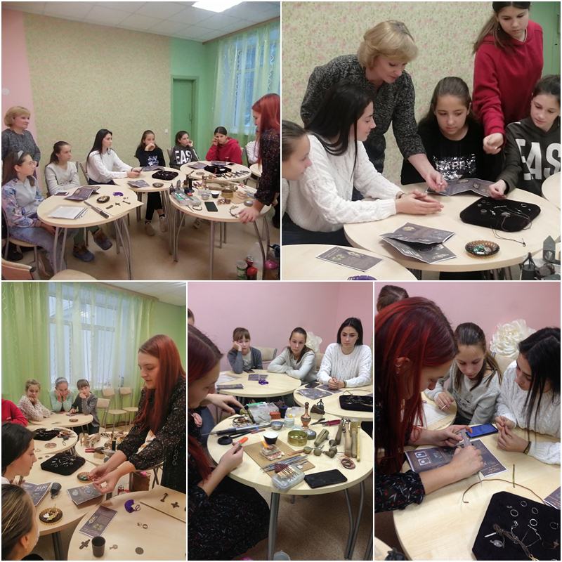 - встреча с выпускницей Анной Чурсиной. Анна – художник – реставратор по металлу. Она окончила Суздальское художественно - реставрационное училище и Строгановскую академию. Встреча прошла в формате мастер – класса. Сначала Анна рассказала, как она пришла к этой профессии, потом провела краткий экскурс в ювелирное дело и продемонстрировала свои творческие авторские работы. Потом показала, рассказала и дала поработать инструментами, материалами и приспособлениями, которые необходимы при создании ювелирных украшений. На мастер – классе все участники сами сделали себе украшения кто-то подвеску, кто-то кольцо. Встреча продолжилась совместным чаепитием.