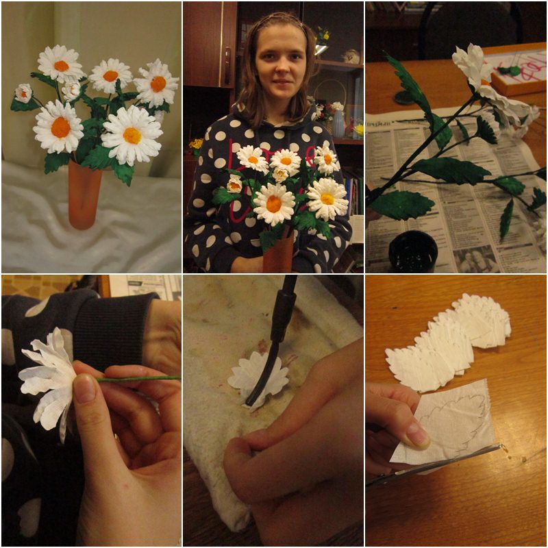 Как быстро летит время. Вот уже и февраль заканчивается. А Даша Б. продолжает осваивать программу «Царство Флоры». Теперь её задача ещё более сложная. По программе ей нужно изучить полевые цветы ромашку, колокольчики, маки и изготовить композицию с этими цветами. Все зимние каникулы Даша просматривала видео и знакомилась с характеристиками этих цветов на Интернет сайтах. А, придя на занятия, приступила к выполнению самих цветов. Первый цветок ромашка. Учащаяся уже самостоятельно рассчитала нужное количество деталей, подобрала ткань, выкройки. Вместе с педагогом разработала алгоритм изготовления и оценочную таблицу качества изделия ромашка. Работу выполняла аккуратно, вдумчиво, не торопясь. Ведь все операции Даше знакомы. Единственная работа по изготовлению венчика ромашки из круга была новая. Но, быстро узнав секрет вырезания лепестков, и с этой задачей справилась отлично. Цветы получились радостными, белоснежными, как настоящие. В этом и вы можете убедиться, посмотрев фото. А дальше Дашу ждут новые открытия. Ведь она задумала изготовить колокольчики двух видов полевые и персиколистные. Значит снова нужно изучать растения, изготавливать выкройки и продумывать этапы работы. Пожелаем удачи.