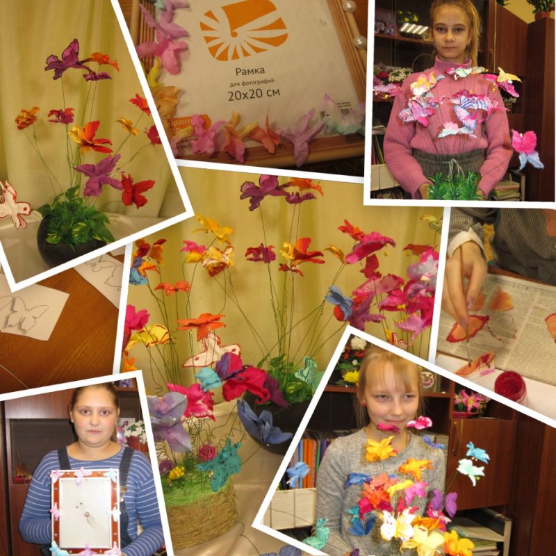 В нашем объединении «Цветочная мозаика» учащиеся делают не только цветы, деревья, декоративные ветки, броши, но и разрабатывают технологию изготовления декоративных бабочек. Это большая тема программы «Калейдоскоп ремёсел» пятого года обучения.