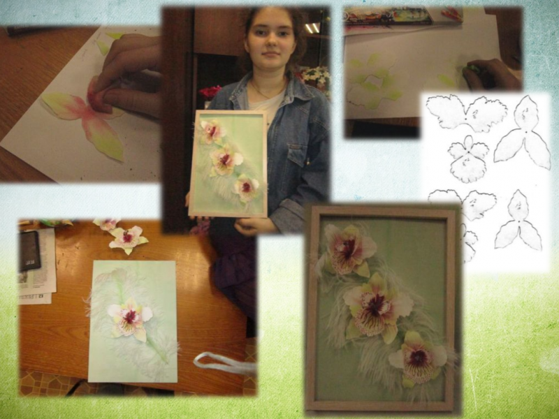 Панно «Орхидеи» - ещё одна работа из фоамирана, которая пополнила копилку изделий Виктории С. Очень нежные, воздушные орхидеи расположились на диковинном перышке. Учащаяся снова выбрала зефирный фоамиран, хотя знала, с какими трудностями придётся встретиться. Он более тонкий, не поддаётся термической обработке, но очень хорошо растягивается. При окрашивании необходимо применять умения, знания и терпение. Виктория работала усидчиво, аккуратно, находила верные решения при возникновении трудностей. В итоги цветы получились необыкновенно воздушные, нежные, красивые. Учащаяся разработала презентацию по технологии изготовления панно «Орхидеи», составила алгоритм изготовления этих цветов и оценочную таблицу качества изделия. Заканчивая изучение программы «Загадочный фоамиран» первого года обучения, Виктория приступила к оформлению портфолио работ. А материал накопился большой: презентации по всем изделиям, алгоритмы, оценочные таблицы, фотографии, участие в конкурсах. За участие во Всероссийском конкурсе «Зимняя сказка», Виктория получила сертификат участника. А работа «Кусочек Вселенной», участвовала в районном конкурсе «Зелёная планета». Надеемся, что защита портфолио пройдёт успешно и следующий год принесёт Виктории больше побед и удачи.