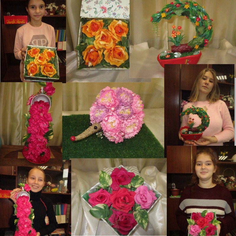 Программа продвинутого уровня. Учащимся предлагается применить знания, умения и навыки в области изготовления объёмных изделий из цветов, ягод, бабочек из ткани. Это могут быть фигурки животных, декоративные шары для украшения детской комнаты, цветочный водопад, композиции в плоской форме для праздничного стола, подарочные коробки к торжествам. А так же учащиеся смогут разработать творческие проекты в области декора причёсок, украшения одежды, головных уборов, украшений для невесты и свадебного стола. Учащиеся группы с удовольствием начали осваивать программу. Через содержание программы учащиеся стартуют в будущее: знакомятся с профессиями дизайнер, мастер парикмахерского дела, художник-оформитель, учитель технологии, стилист. И уже сейчас есть некоторые результаты. Например, Вика К. изготовила подарочную коробку с розами и фигурку ежа. Анастасия А. создала цветочный водопад и декоративного ёжика. Полина Л. разработала и сделала необычную композицию в виде «бонсай». Виктория С. изготовила подарочную коробку с цветами из креп сатина. Группа сильная, с новыми творческими идеями и фантазиями. Все работы вы можете увидеть и оценить, посмотрев наш коллаж.