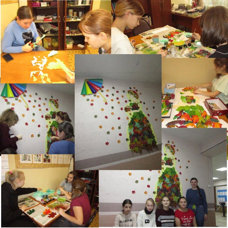 Осенняя пора. Природа разными красками украсила поля, леса, водоёмы. Цвета необыкновенные: от ярко жёлтых, до тёмно бурых. В нашем Центре, каждое объединение участвует в украшении дома. Автором идеи стала Виктория С. Разноцветные листья, вылетающие из зонтика, одевают даму в сказочный наряд. Мальчишки объединения НТМ разработали и сделали объёмный макет разноцветного зонтика. Девочки объединения «Цветочная мозаика», создали образ «Осени» в виде сказочной дамы, украсив её платье листьями берёзы, дуба, клёна. Листья сделали из ткани, обработанной желатином. А дальше полёт фантазии. Дети очень любят работать с красителем «Батик», смешивать разные цвета и получать новые оттенки. Листья получились необыкновенных цветов и оттенков. А платье лёгкое, яркое, сказочное. И последний этап работы: собрать всё в виде коллажа на стене. Общая работа подружила детей наших объединений ещё больше. Мы и раньше сотрудничали. Вместе украшали холл к Новому году. А результат этого коллективного творческого дела вы можете увидеть, посмотрев на фото.