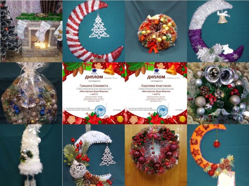 В декабре месяце 11 учащихся объединения "Флористика" участвовали во Всероссийском творческом конкурсе "Мастерская Деда Мороза". На конкурс были представлены творческие работы учащихся в новогодней тематике: рождественские венки, новогодние подсвечники, новогодний месяц, елочка-топотушка.