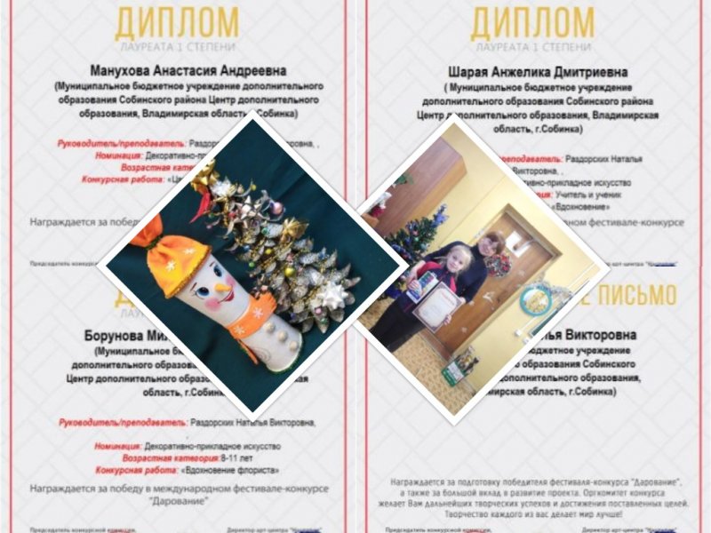 На базе ЦДО проводился творческий конкурс "Новогодняя карусель", победителем конкурса из объединения "Флористика" стала самая юная воспитанница - Янушкевич Елизавета, в номинации "Ох уж эта елочка", с работой "Елочка и снеговик".