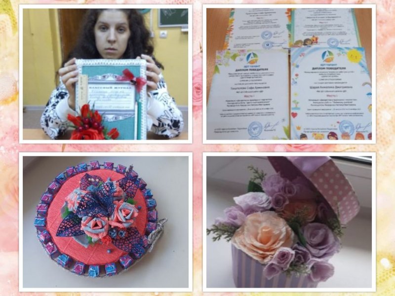 4 учащихся объединения "Флористика" участвовали в Международном конкурсе изобразительного искусства, декоративно-прикладного творчества и фотографии "Цветочный вернисаж", "Всероссийский конкурс осенних гербариев и флористических работ "Очарование осени", Всероссийский конкурс детско-юношеского творчества ко дню учителя "Педагог!Нет звание выше на свете", Международный конкурс творческих работ для детей с особыми потребностями "Дорогою добра". На конкурс были представлены творческие работы учащихся: в осенней тематике - цветочная композиция "Нежный флер", журналы для педагогов , композиция выполненная в технике свит дизайн "Цветочный калейдоскоп".