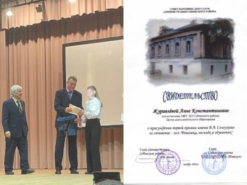 В ноябре 2022 года в селе Черкутино состоялось торжественное награждение ребят района, занявших призовые места в творческих конкурсах, посвященных В.А.Солоухину. Среди победителей Журавлева Анна. На конкурс она представила эссе " Ромашка, василёк и одуванчик". Поздравляем Аню и желаем дальнейших творческих успехов. Молодец!!!