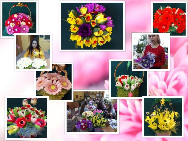 В преддверии праздника - Международного женского дня 8 Марта воспитанницы объединения "Флористика" подготовили для своих мам и бабушек огромное количество творческих работ выполненных в технике свит дизайн - это корзинки с тюльпанами, композиции с герберами.Работы выполнены с заботой и любовью.