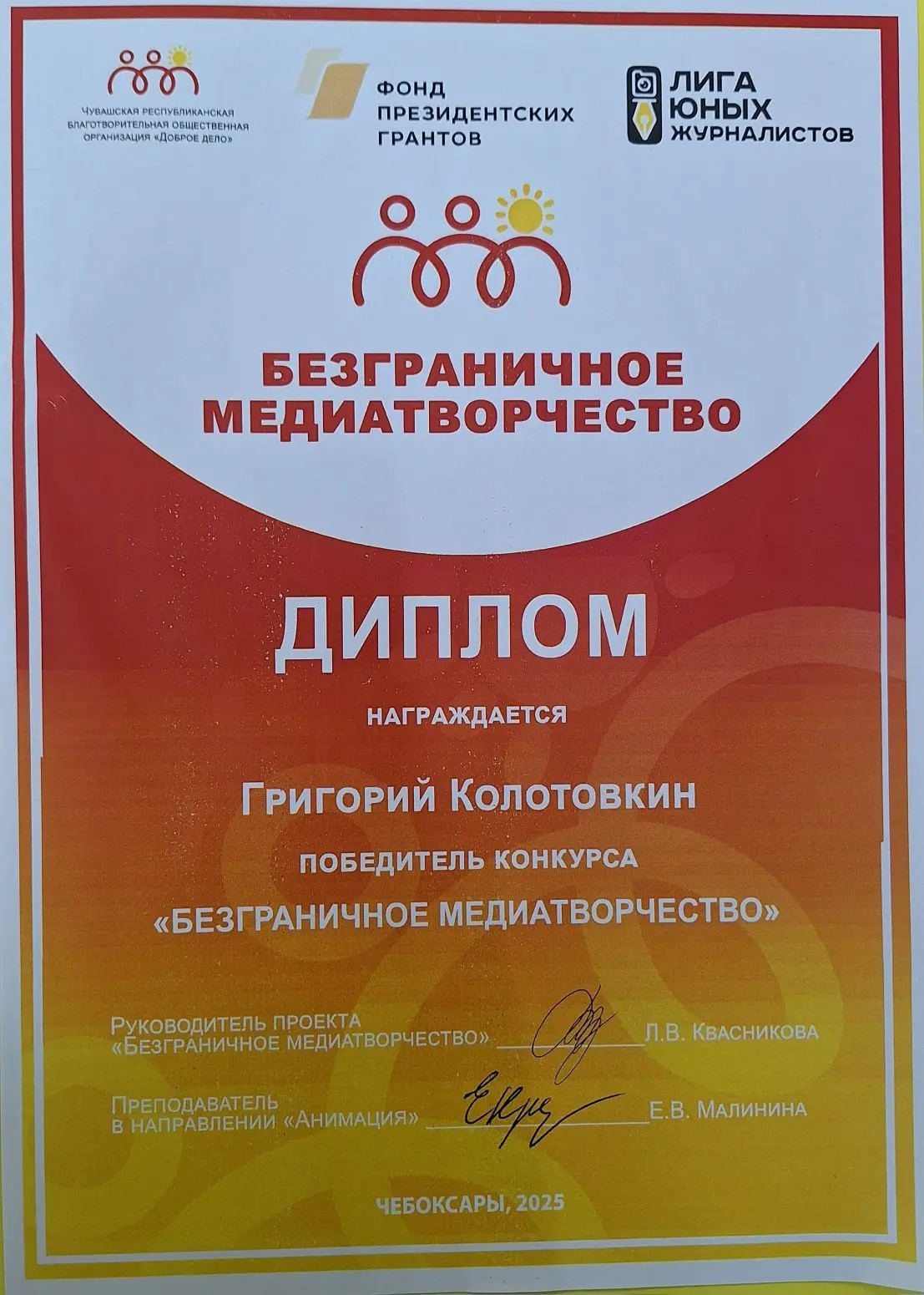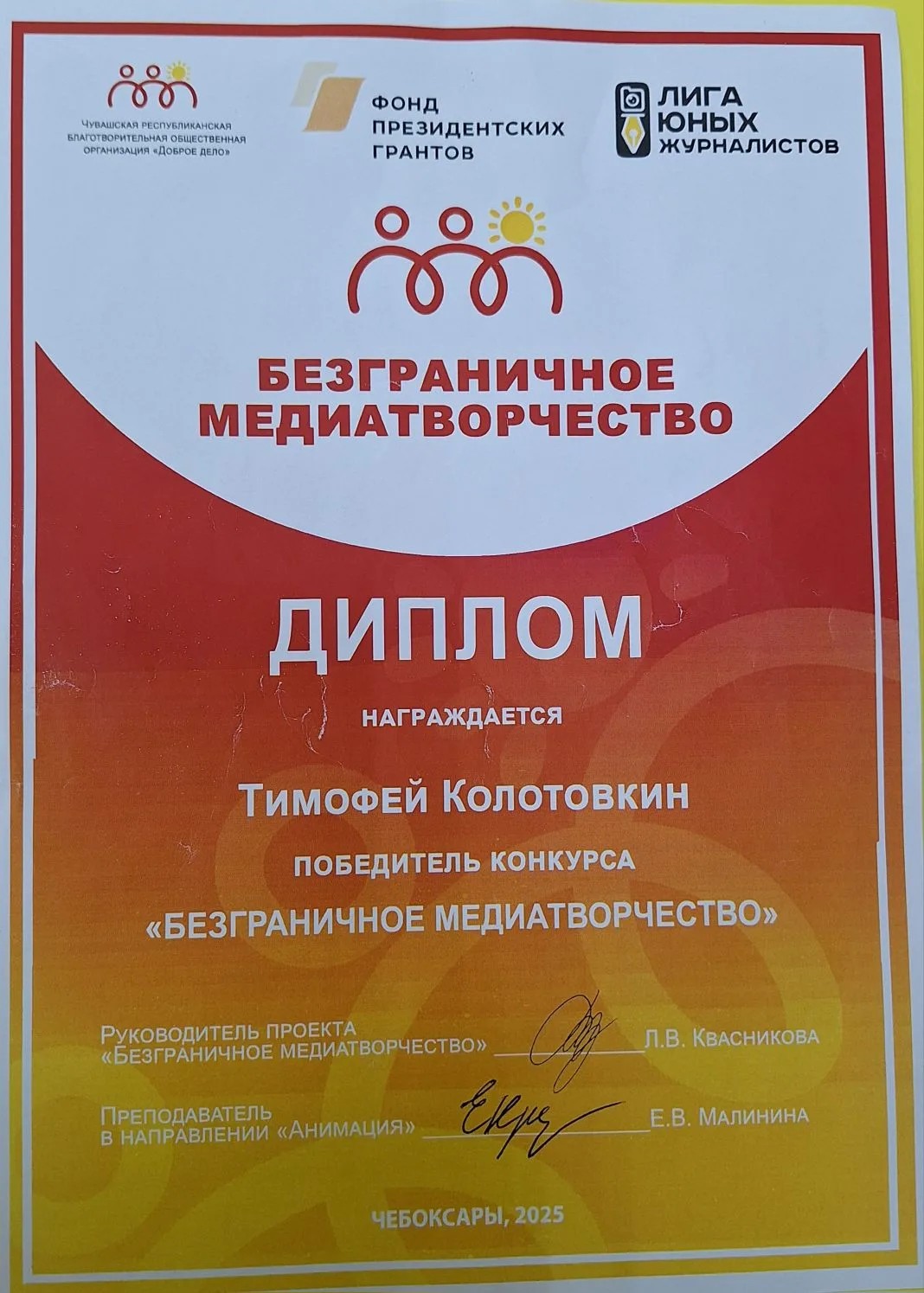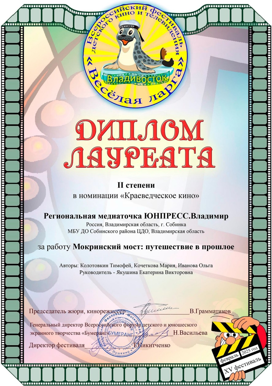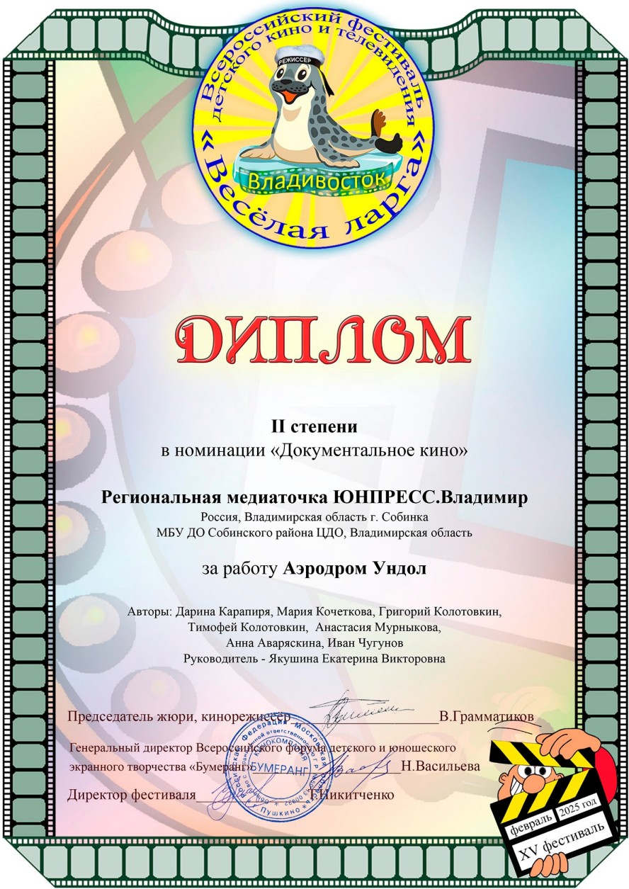 - Всероссийский фестиваль детского кино и телевидения "Веселая ларга" - дипломы 2 степени за работы "Мокринский мост: путешествие в прошлое", "Аэродром Ундол".