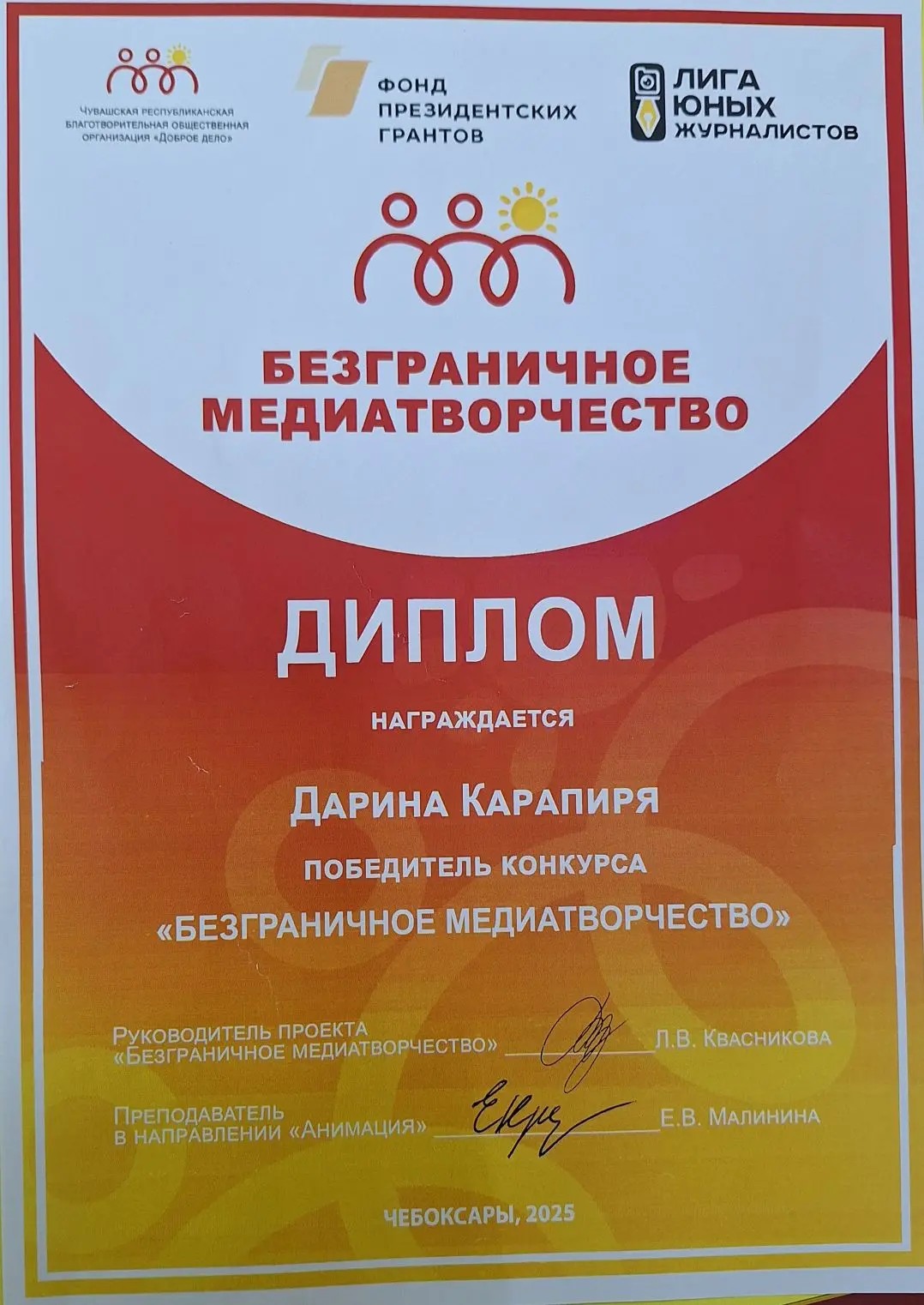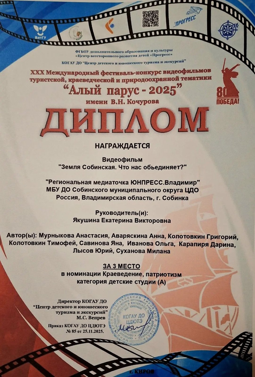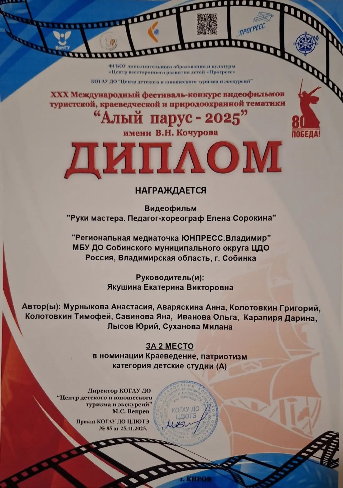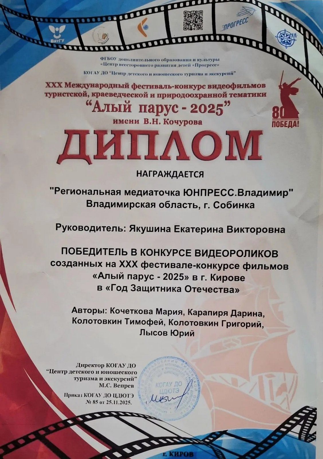 - XXX Международный фестиваль-конкурс видеофильмов туристской, краеведческой и природоохранной тематики "Алый парус - 2025" - победитель в конкурсе видеороликов, 2, 3 место в номинации Краеведение.